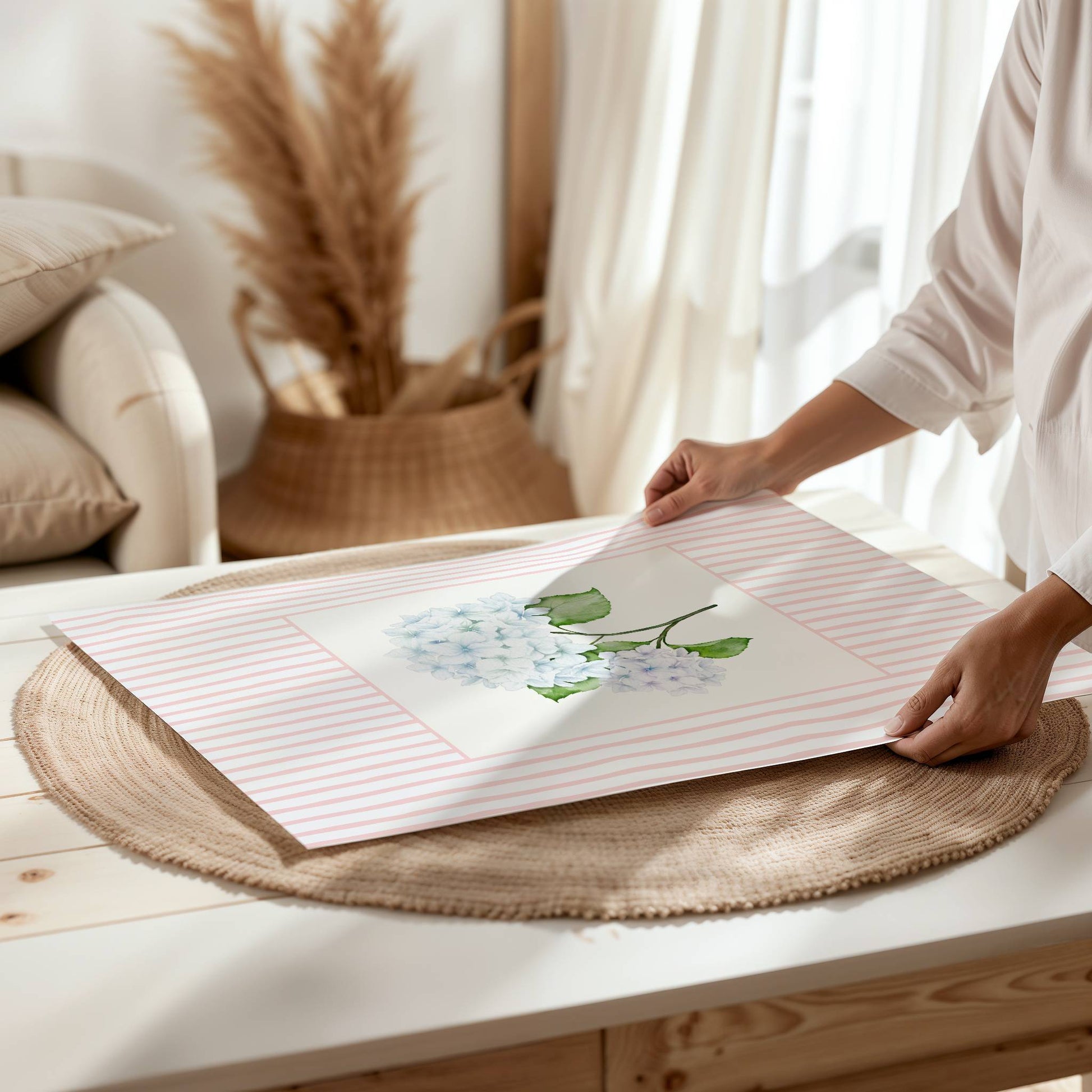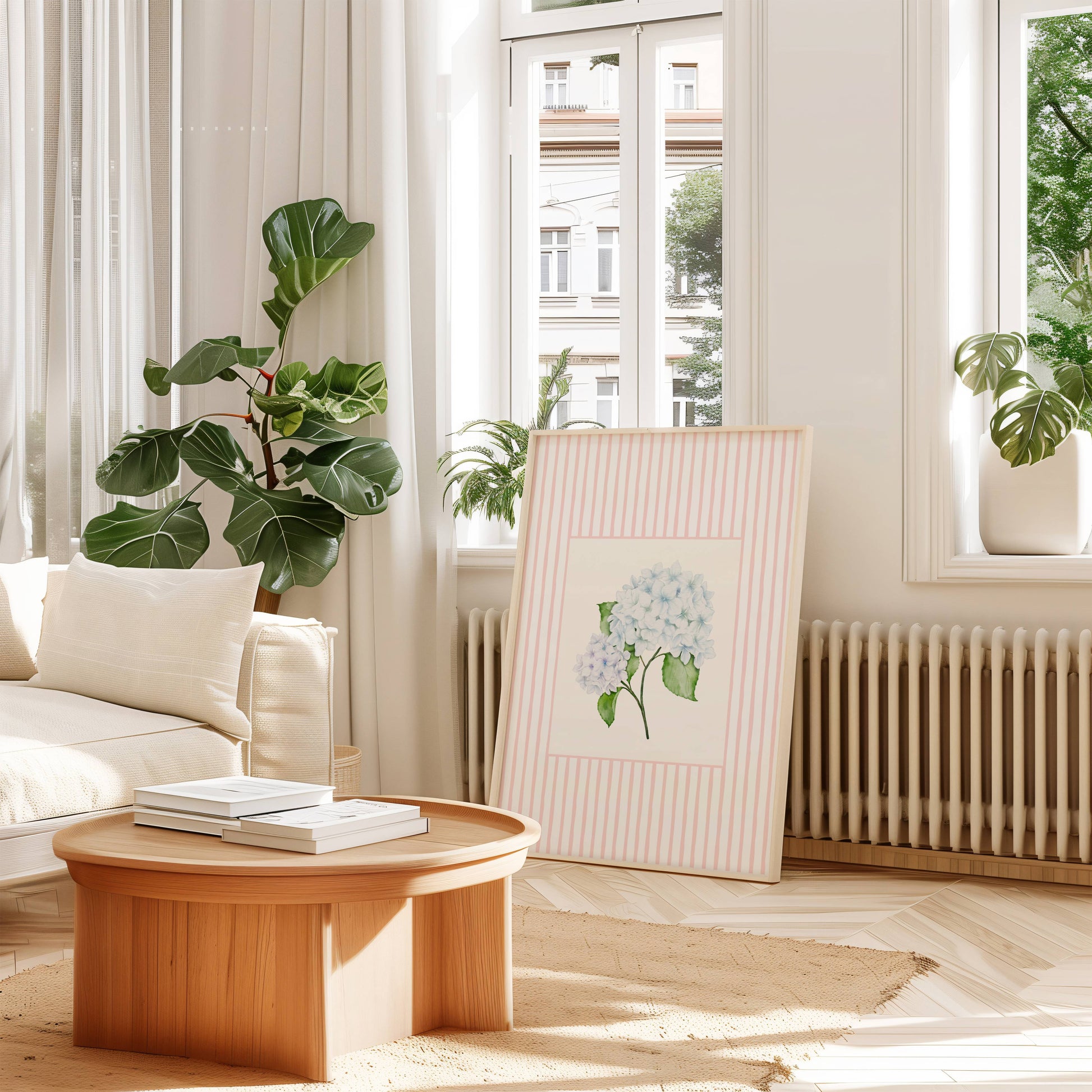 Blue Hydrangea Art Print – Soft Floral Wall Art with Pink Stripe Frame