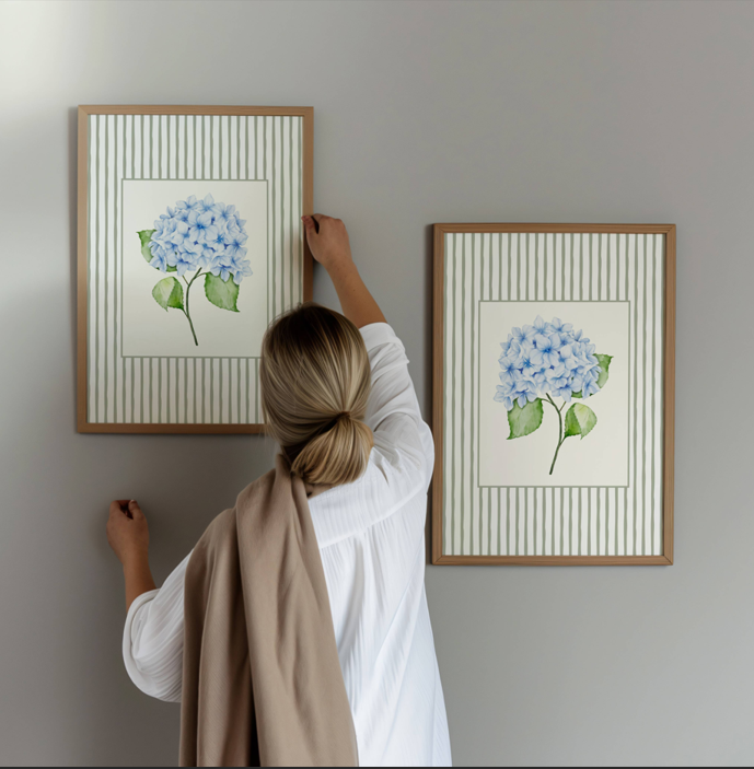 A timeless floral art print featuring soft blue hydrangeas set against refined vertical stripes.
