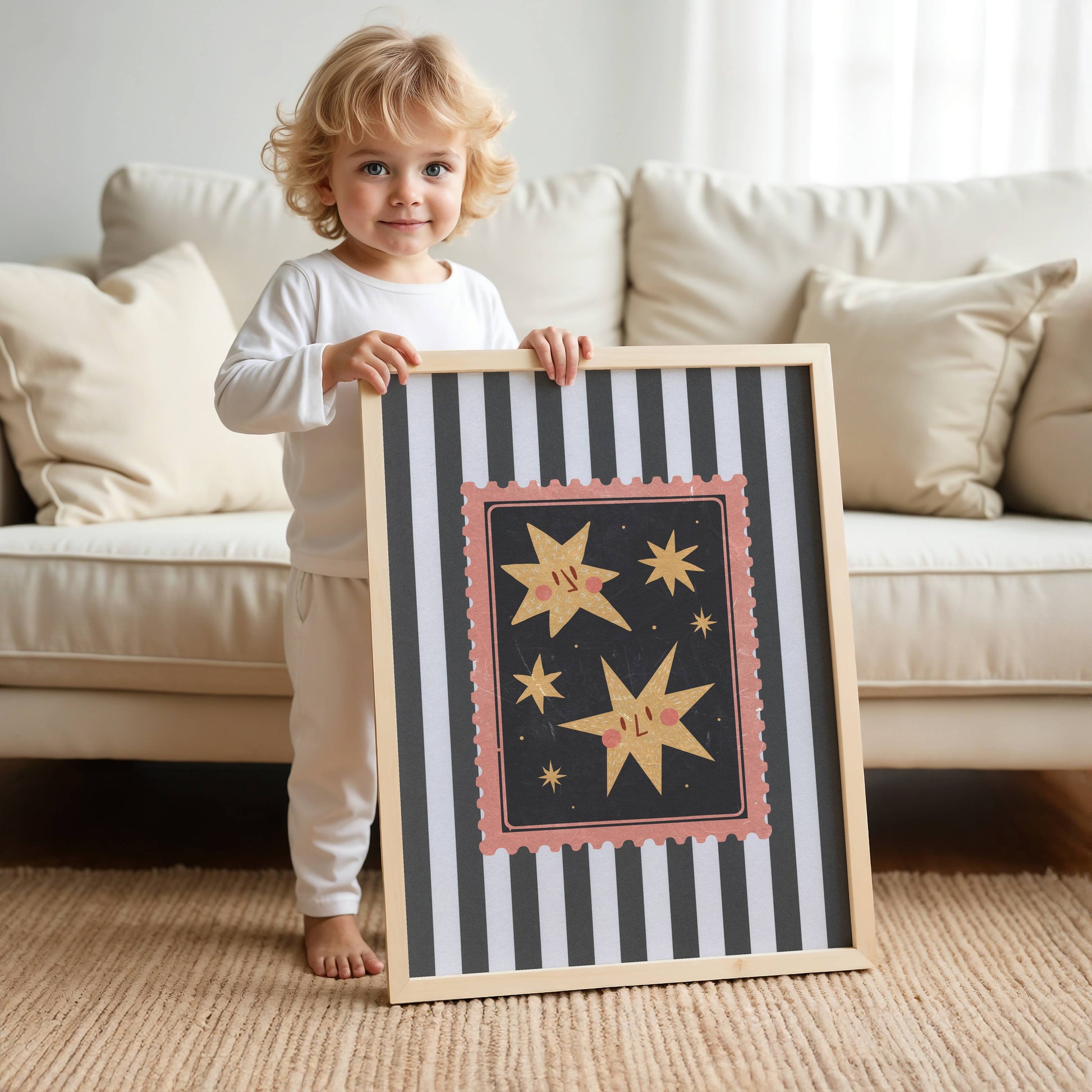 Soft vertical stripes and hand-drawn gold star details create a timeless, gently playful look that feels both nostalgic and warm.